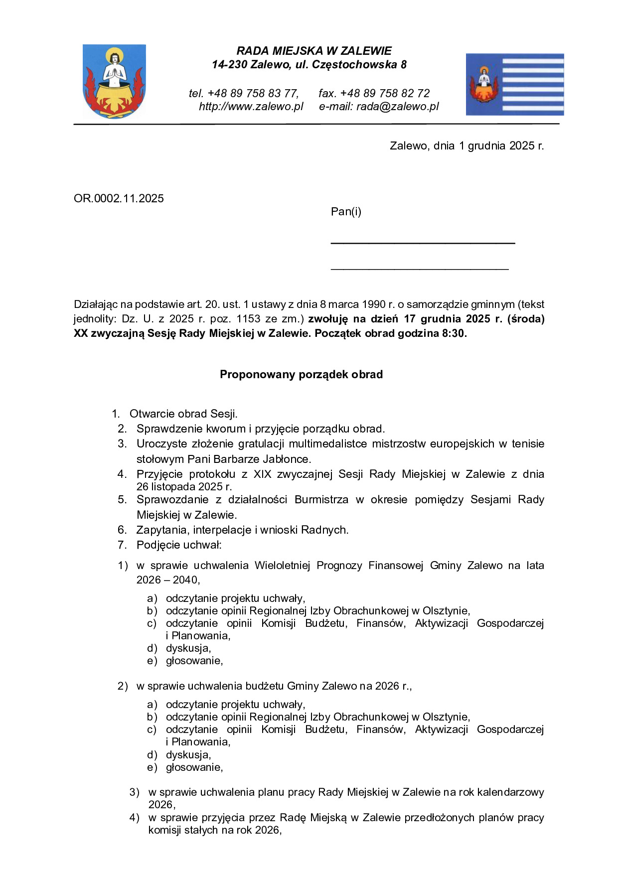 Zaproszenie na XX zwyczajną Sesję Rady Miejskiej w Zalewie - 17.12.2025 r. poniedziałek, 01 grudzień 2025 13:08 wielkość czcionki Zmniejsz czcionkę Powiększ czcionkę Czytany 27 razy Wydrukuj Email Ostatnio zmienianyponiedziałek, 01 grudzień 2025 13:17 100s2smodern Tweetnij Więcej w tej kategorii: « Ogłoszenie o naborze na członków komisji konkursowych do oceny ofert składanych w ramach otwartych konkursów ofert na realizację zadań publicznych w 2026 roku Powrót na górę
