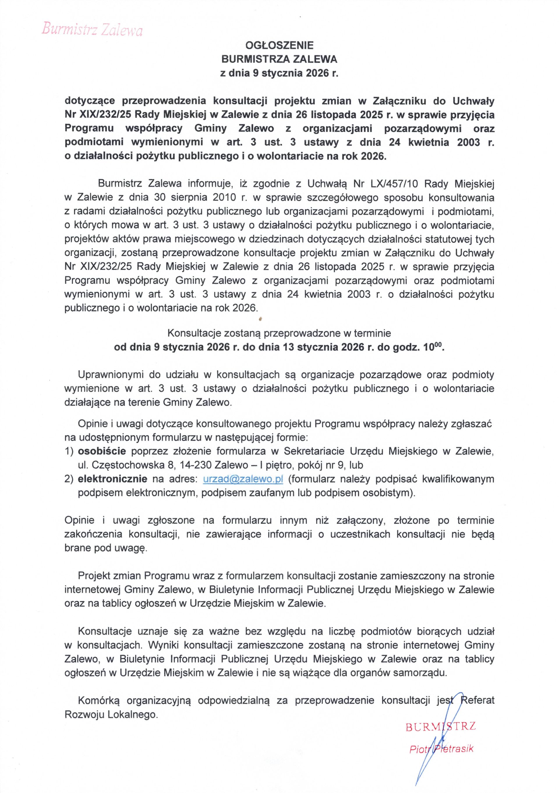 Ogłoszenie w sprawie konsultacji projektu zmian do Programu Współpracy Gminy Zalewo z organizacjami pozarządowymi na rok 2026