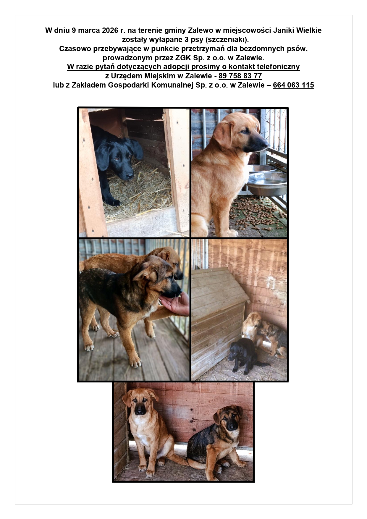 W dniu 9 marca 2026 r. na terenie gminy Zalewo w miejscowości Janiki Wielkie zostały wyłapane 3 psy (szczeniaki). Czasowo przebywające w punkcie przetrzymań dla bezdomnych psów, prowadzonym przez ZGK Sp. z o.o. w Zalewie.