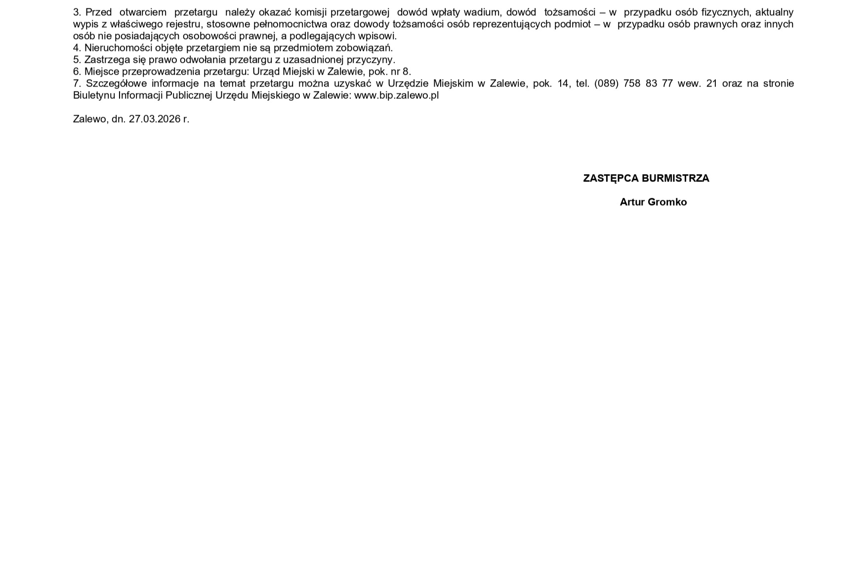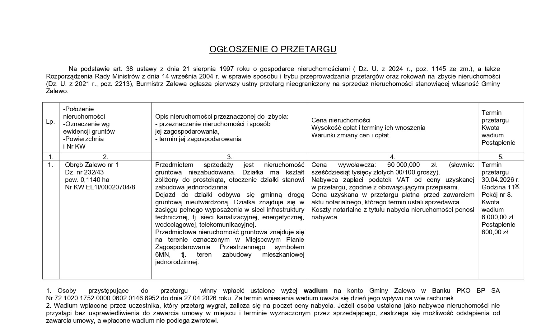 Ogłoszenie o przetargu - działka 232/43 obręb Zalewo nr 1