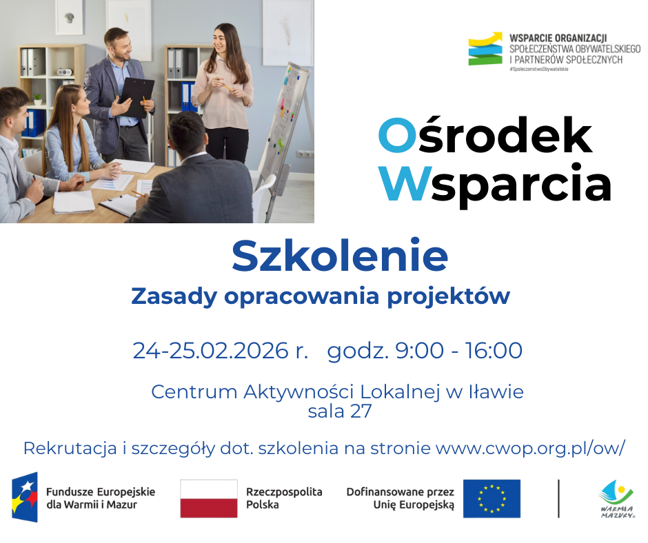 Aby zwiększyć szanse na otrzymanie grantu, zapraszamy na bezpłatne szkolenia subregionu elbląskiego organizowane przez Ośrodek Wsparcia Organizacji Społeczeństwa Obywatelskiego i Partnerów Społecznych, prowadzony przez Stowarzyszenie Centrum Wspierania Organizacji Pozarządowych i Inicjatyw Obywatelskich (CWOP).